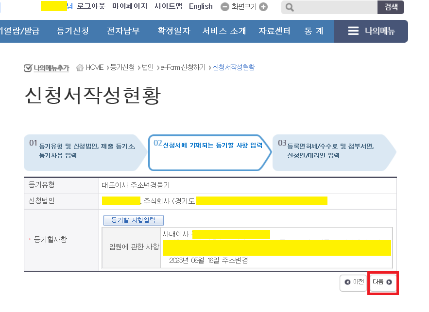 STEP2. 인터넷 등기소로 대표자 주소변경등기 하기